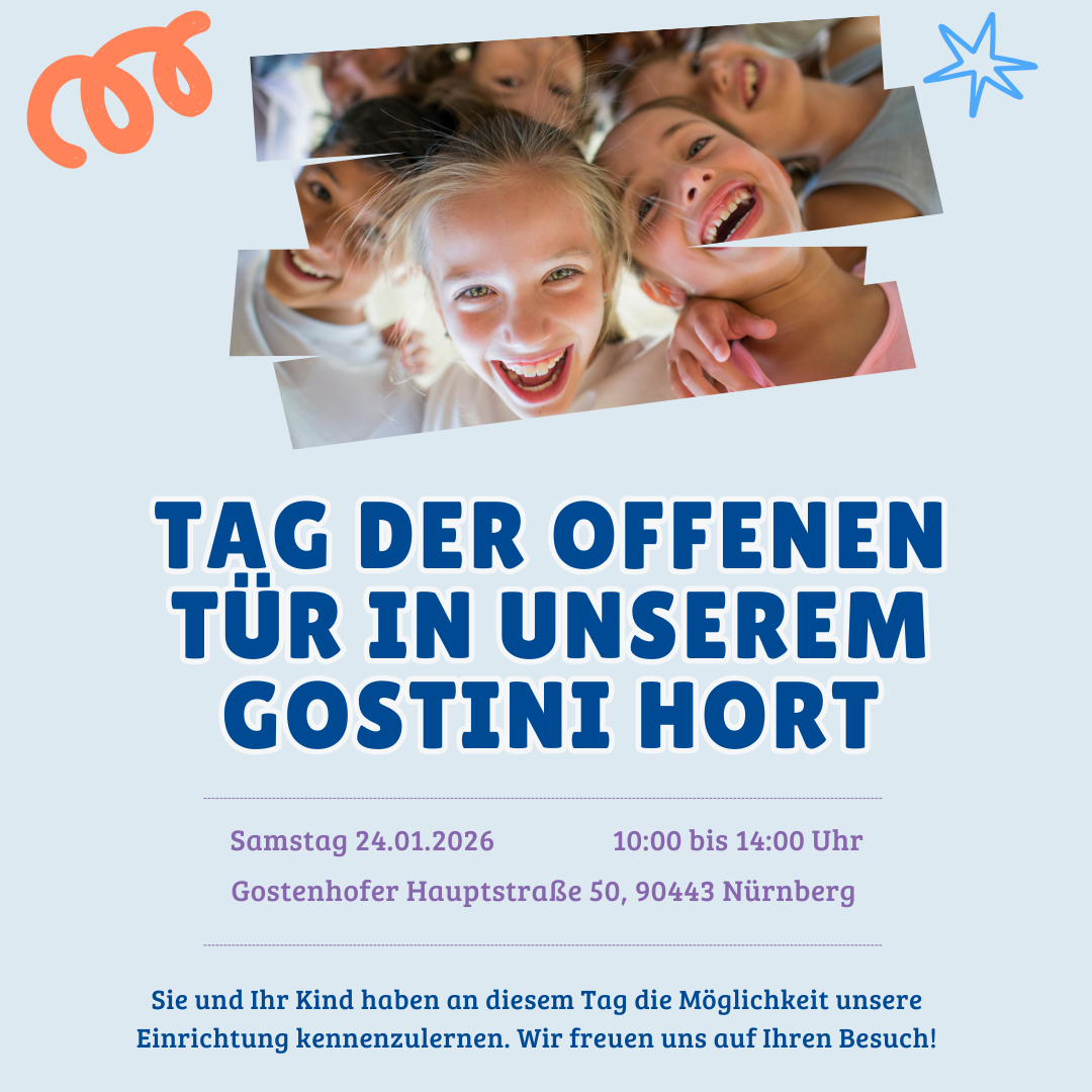 in Nürnberg werden die Betreuungsplätze für das neue Kita-Jahr ab dem 7. Februar vergeben. Wenn Sie Ihr Schulkind ab September 2026 in unserem Hort anmelden möchten, haben Sie am Samstag, den 24.01.2026 zwischen 10 und 14 Uhr, die Möglichkeit zum Tag der Offenen Tür bei uns vorbeizukommen. So können Sie sich zusammen mit Ihrem Kind ein Bild von unserer Einrichtung und unserer Pädagogik machen. Wir freuen uns auf Ihren Besuch!