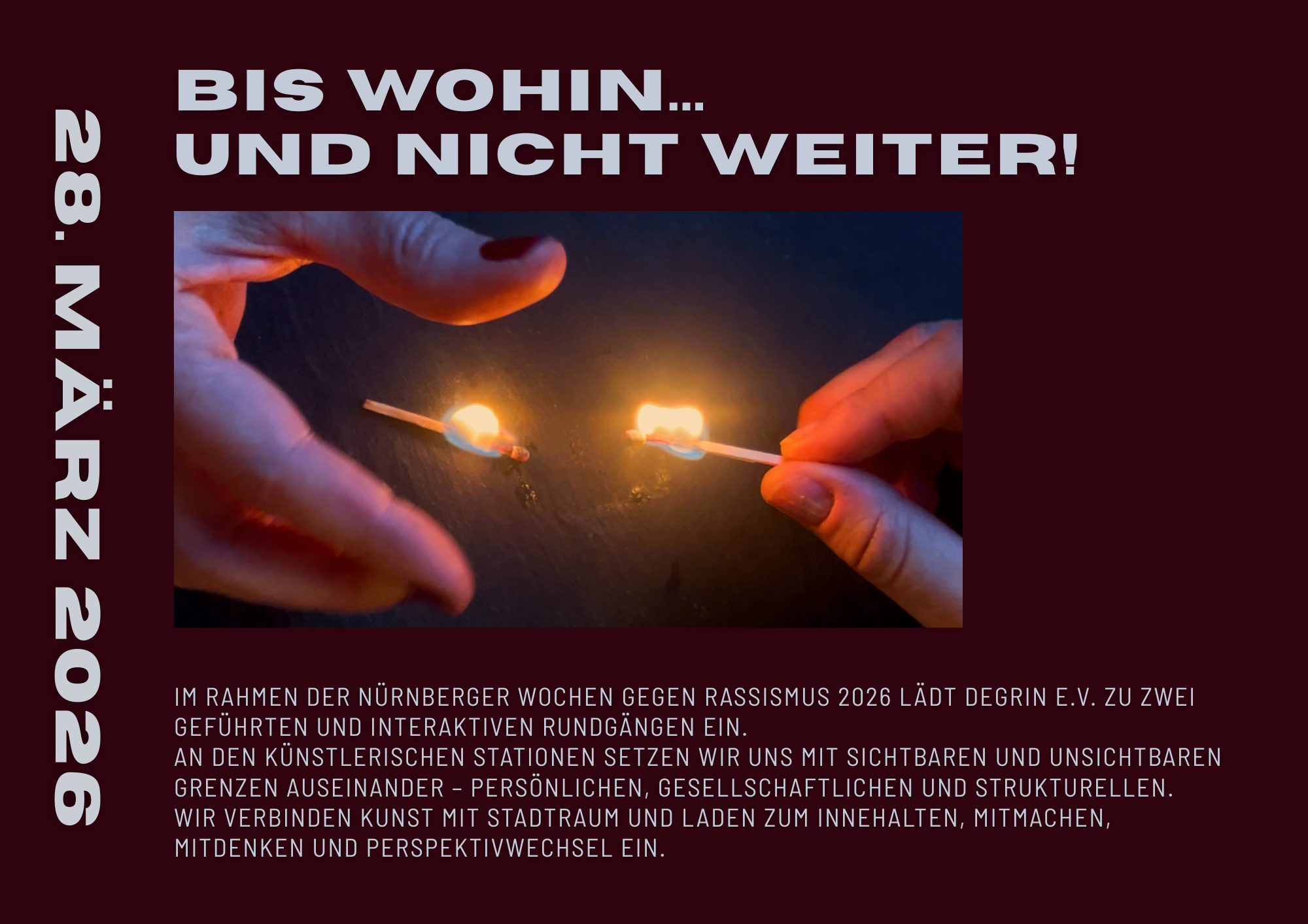 „BIS WOHIN… UND NICHT WEITER!“ ist eine interaktive künstlerische Führung im Rahmen der Nürnberger Wochen gegen Rassismus 2026. Das Projekt setzt sich mit sichtbaren und unsichtbaren Grenzen auseinander – persönlichen, gesellschaftlichen und strukturellen.